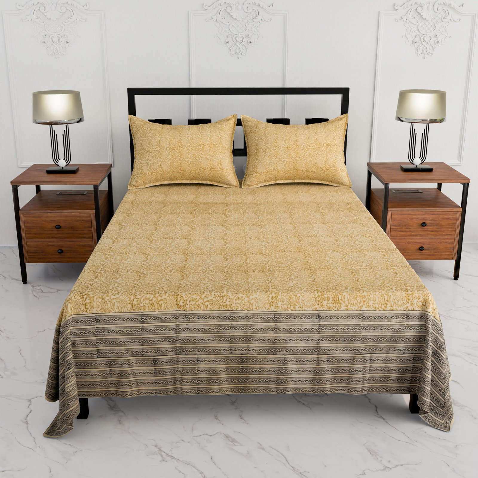 Premium Double Bed Sheet – Floral Hand Block Style Print (Mustard Yellow & Beige)