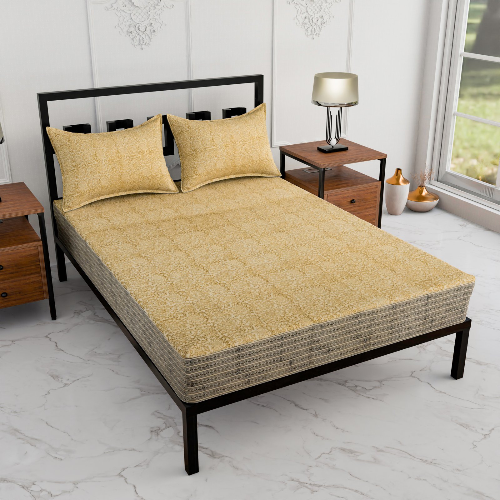 The bedsheet comes in a soothing mustard yellow base with delicate beige floral detailing, finished with a contrasting ethnic border in beige and black tones, adding a refined and premium touch to the overall design.