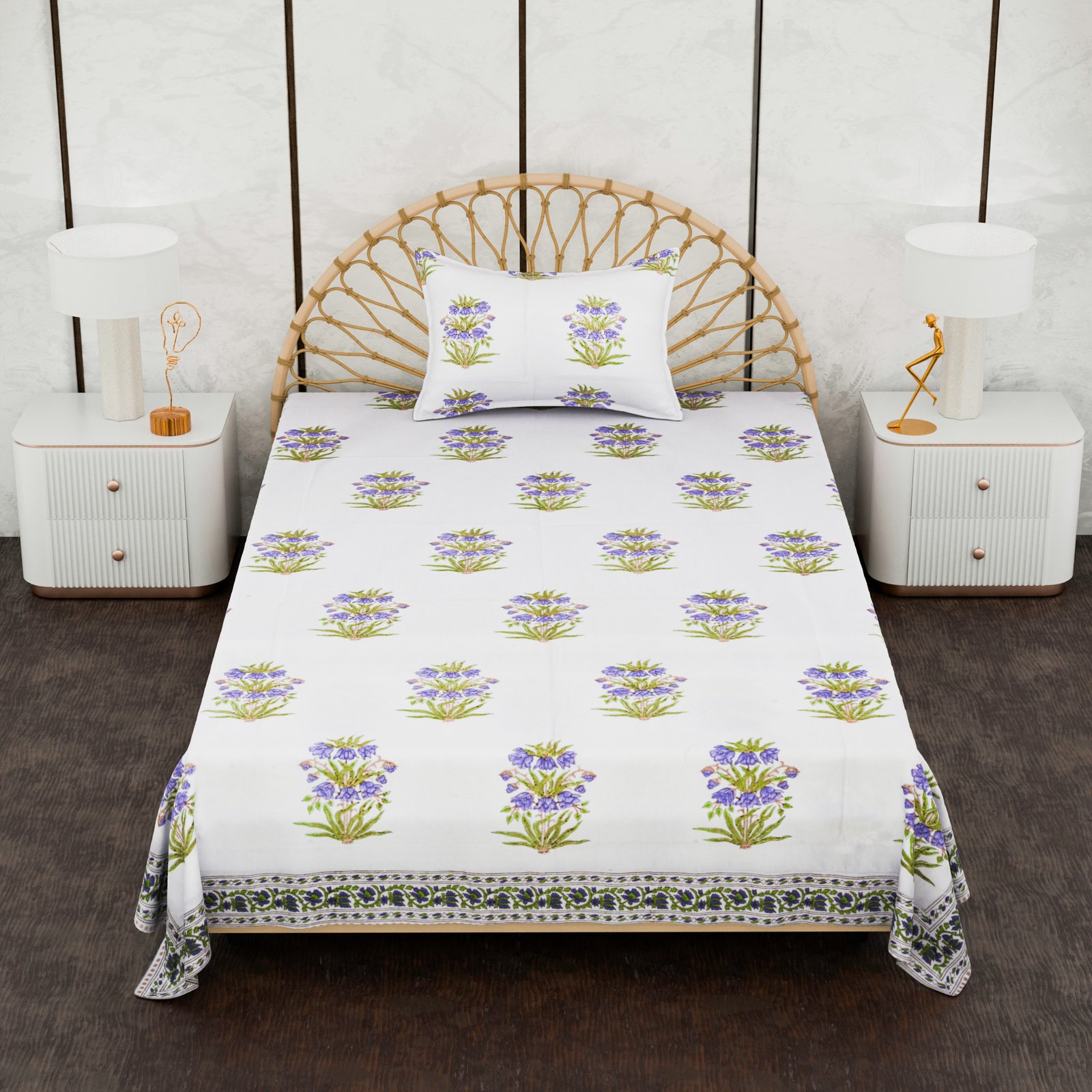This single bedsheet features delicate floral plant motifs, inspired by traditional Indian hand block art, bringing a fresh, calm, and elegant feel to your bedroom.